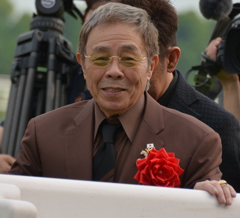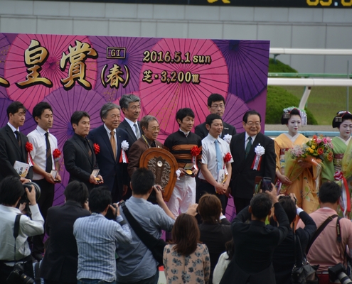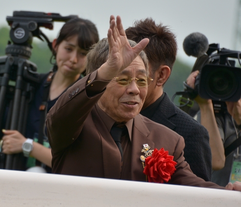 第153回天皇賞(春)(GI)を制したキタサンブラック号の馬主さんは言わずと知れた北島三郎さん。表彰式はかなり遠くから見てたのですが、それでもと思って下に降りたらアップの写真が撮れました。私の亡くなった母に見せたら大喜びだったかもです。